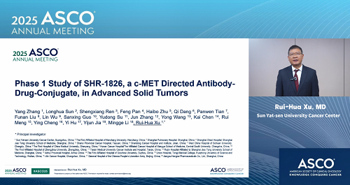 2025年美国临床肿瘤学会(ASCO)年会于5月30日至6月3日在美国芝加哥举行。本次大会,由中山大学肿瘤防治中心徐瑞华教授牵头、AG真人自主研发的靶向细胞间质上皮转换因子(c-MET)ADC药物SHR-1826的一项I期临床研究入选临床科学研讨会,并由徐瑞华教授口头报告了该研究结果。该研究由43家国内中心共同完成。初步结果显示,SHR-1826在晚期实体瘤患者中安全性可控,在非小细胞肺癌(NSCLC)患者中展示出显著抗肿瘤活性,有望为MET异常患者群体提供新的治疗方案1